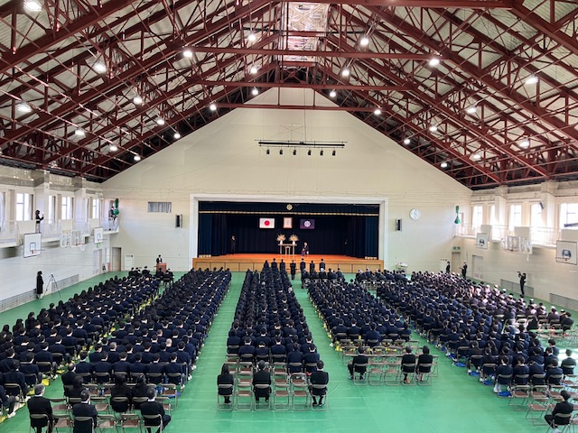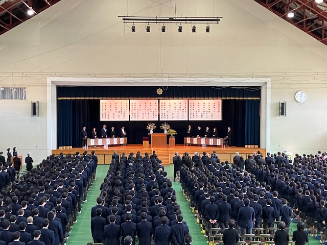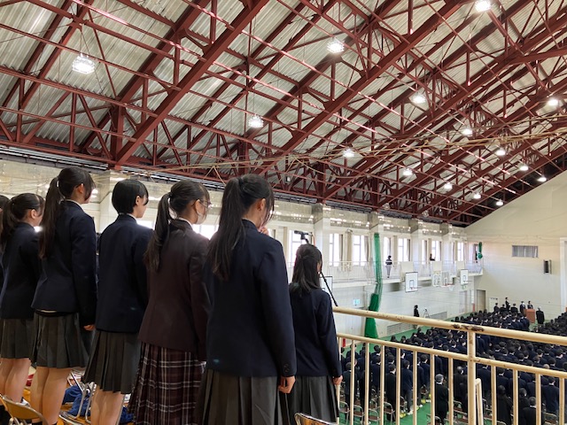 その後、体育館に集まり、「祭事」ではお礼・お願いの言葉、玉串奉奠を行い、「式典」では国歌斉唱、永年勤続職員表彰、校長式辞、教務総長(ご代理)祝辞、生徒による所願表明、学園歌斉唱がありました。
