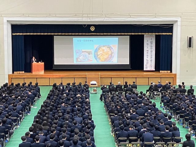 記念講演では、一般社団法人高梁川流域学校 代表理事 坂ノ上博史氏(高48回)が演題「越境と自由~過去も未来も変えられる~」をお話くださいました。